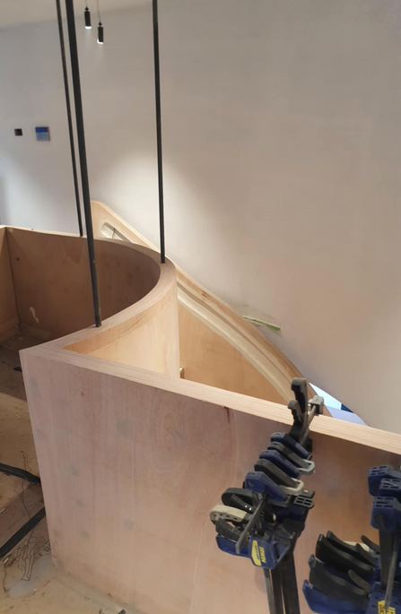 The construction process combined traditional craftsmanship with modern techniques: laminated timber sections were shaped, assembled, and refined on-site, then sanded and prepared to create a flawless, sculptural surface. Once installed, the finished structure delivers a clean, contemporary aesthetic, highlighted by integrated lighting and smooth continuous lines that guide the user down the stairs.